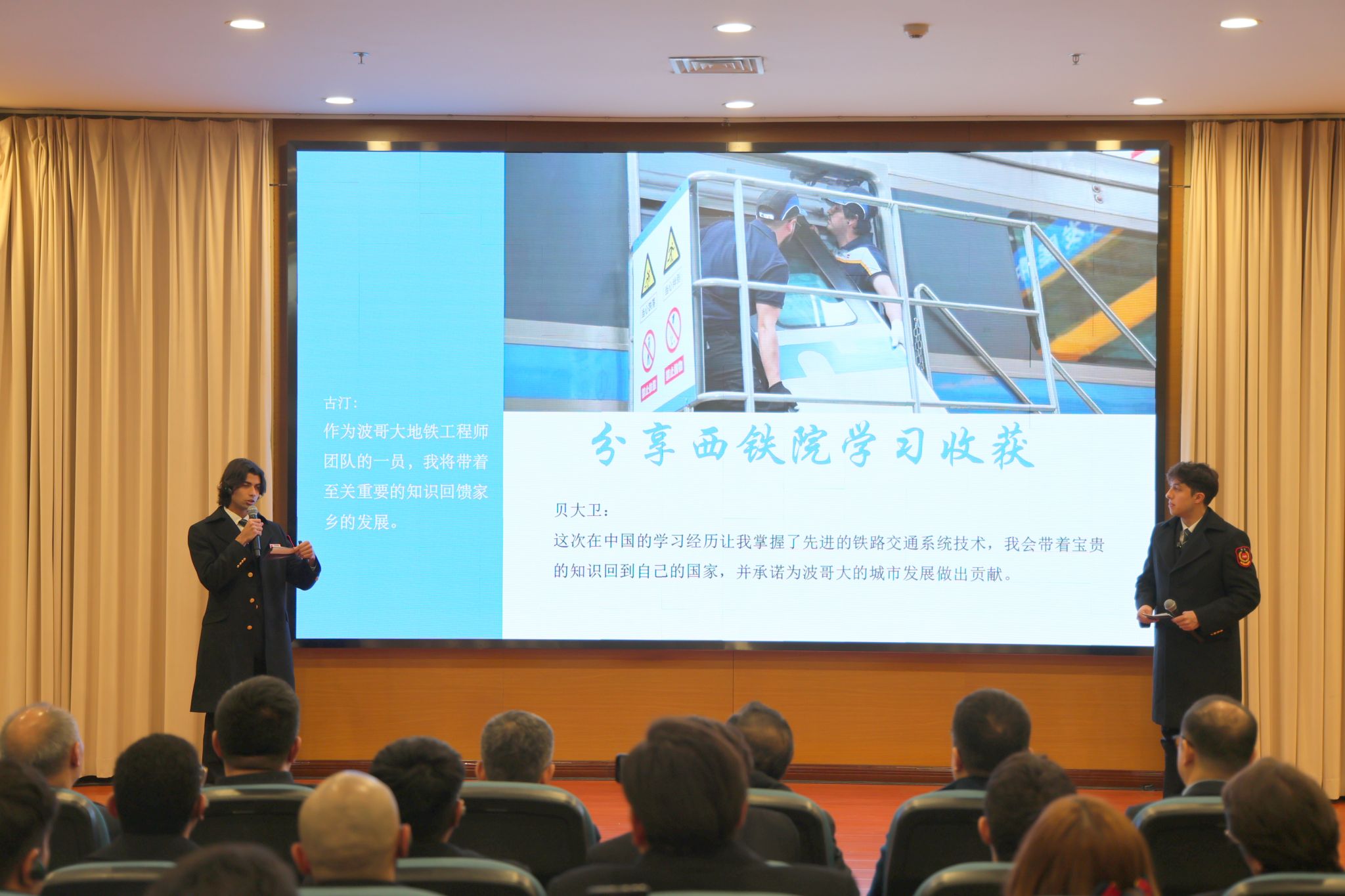 典礼在庄重热烈的氛围中拉开帷幕,现场播放的纪实视频生动展现了学员们自2024年10月培训以来的学习生活点滴。一年来,西安铁路职业技术学院与西安市轨道交通集团有限公司共同为留学生构建了“学校+企业”“理论+实践”双轮驱动的人才培养体系,创新组建了“中文教师+专业教师+企业导师+西语助教”四位一体的教学团队,精心打造了“教室—实训室—地铁线”三阶递进的实景教学平台,联合编写了8套双语教材和百余份双语讲义。西安铁路职业技术学院的教授们将数十年的教学智慧化为一堂堂生动的理论课程,西安轨道交通集团的工程师们以“手把手”的耐心倾囊相授实操技术。此外,校企还共同组织开展了丰富多彩的文化交流活动,帮助学员在感知中国、理解西安的过程中,拓宽视野,广结友谊。