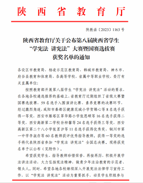 近日,陕西省教育厅公布的《关于第八届陕西省学生“学宪法 讲宪法”大赛暨国赛选拔赛获奖名单的通知》中,我院选派的交通运输学院铁路物流2201班学生杨卓在比赛中荣获高校组三等奖。