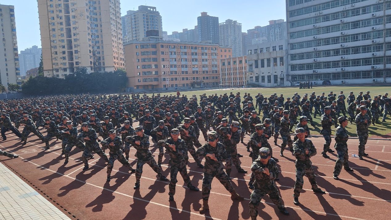 同学们开始了军体拳、匕首操的训练,展露锋芒,招招势如破竹,拳拳虎虎生风。整齐划一的步伐、铿锵有力的动作,伴随着强有力的吼声,同学们将军体拳的动作要领记在心里,一招一式展现的淋漓尽致。