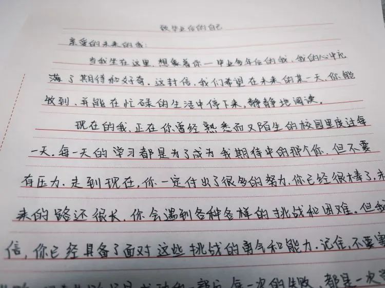 最后,在“善爱我”环节中同学们在信纸上完成了《写给三年后自己的一封信》,大家都与“未来的自己”进行了一场深度对话:有的同学规划了自己的大学学习计划;有的畅想三年后的工作环境;有的还想着专升本;有的立志要做一名四有好青年……“对话”时间到,同学们小心翼翼地将信装进信封,完成了这次与自己的“三年之约”。活动结束后,不少同学都表示,非常期待三年后再次收到这封信,非常期待那时的自己已经完成了既定的目标。