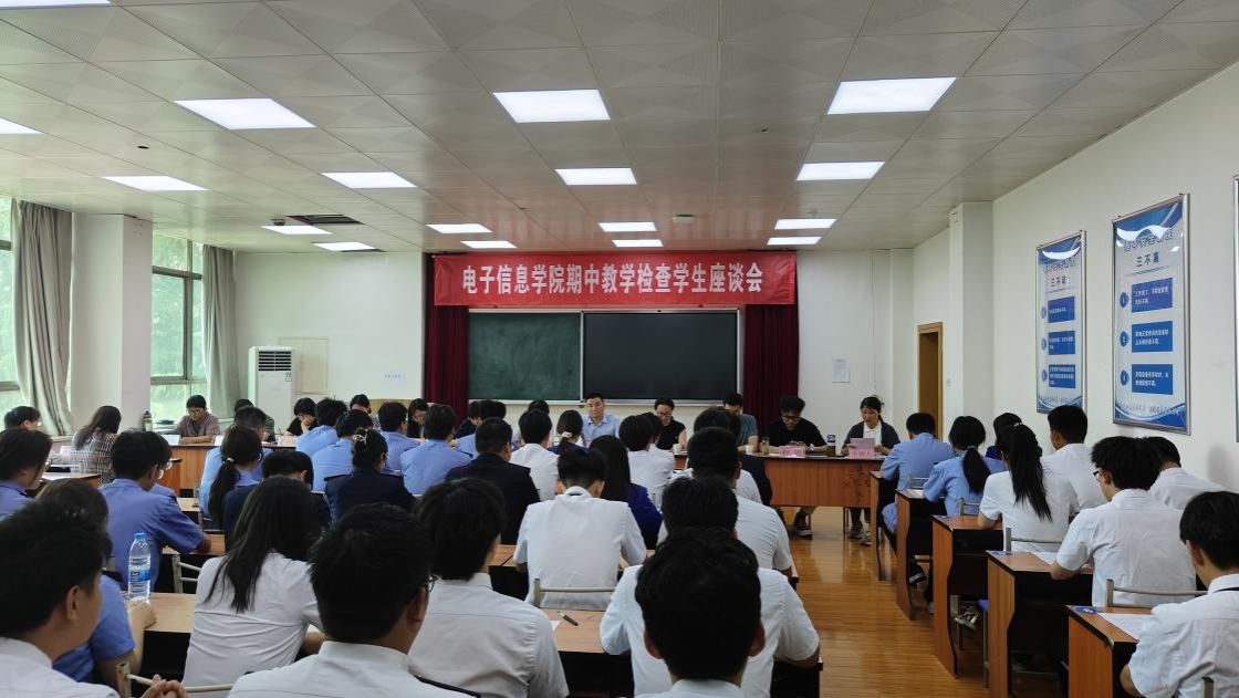 5月15日,电子信息学院在自强校区教学楼407教室举办期中教学检查学生座谈会,教务处程民利、发展规划处王旭波、马克思主义学院郝占辉、基础部王婷、电子信息学院副院长冯国良、学工办主任薛明、各教研室教师代表、22、23级学生代表参加会议,会议由院办主任高琳主持。