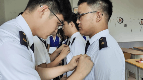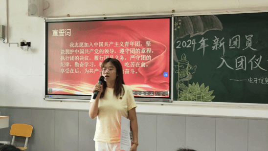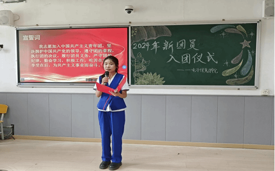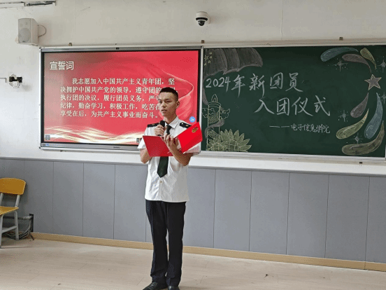 仪式在庄严的国歌声中拉开序幕,全体师生肃立,高唱国歌,表达对祖国的热爱和敬意。团员代表张文澜宣读了新团员名单,并向他们表示热烈的祝贺。在团旗的见证下,老团员为新团员佩戴团徽。团徽在胸前闪耀,不仅是一份荣誉,更是一份责任,它象征着新团员们将肩负起时代赋予的重任,为实现中华民族的伟大复兴而努力奋斗。
