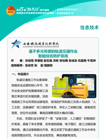 由机电院张宗芳,张配等指导,孙启恒等提交的参赛作品《基于多元传感的轨道交通作业智能综合防护系统》获一等奖;