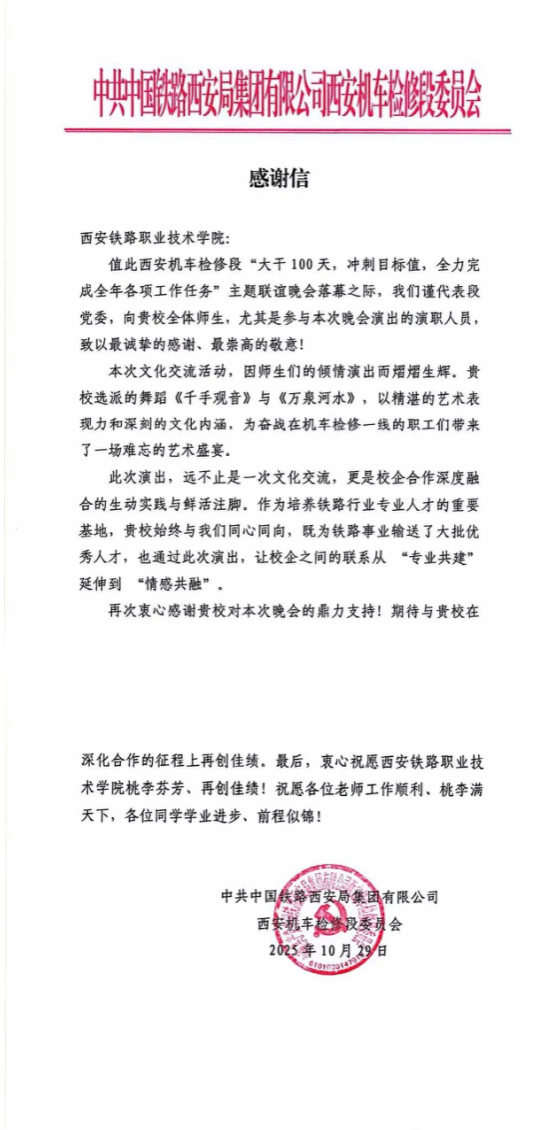 近日,学院收到来自中国铁路西安局集团有限公司西安机车检修段党委的感谢信。信中就我院师生在该段职工联谊晚会中的精彩演出表示衷心感谢,并对校企合作的丰硕成果给予高度评价。