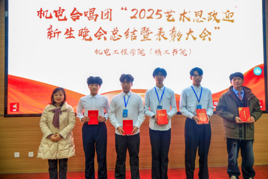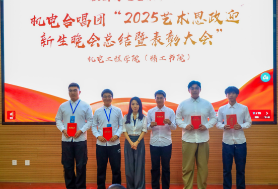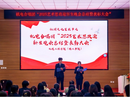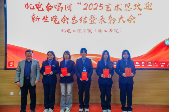 11月20日机电合唱团“2025艺术思政迎新晚会总结暨表彰大会”在机电工程学院阶梯教室隆重举行。机电工程学院党总支书记宋永兴、党总支副书记韩臻、合唱团指挥江冰老师以及合唱团100名全体成员参加了表彰大会。