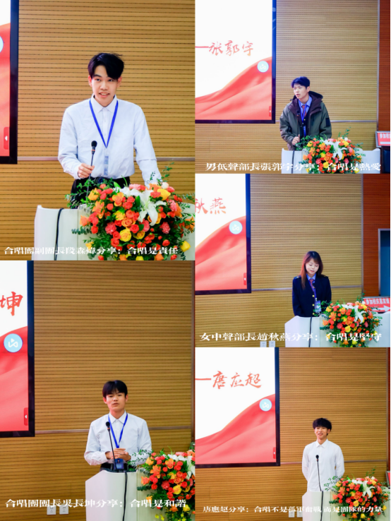 会议在演出视频回放中拉开帷幕。来自不同声部的学生分享了排练中的难忘瞬间。“合唱是热爱”,男低声部长张郭宇深情地说:“这里承载着我许许多多的回忆。最开始我们还只是二十几个热爱音乐的青年,渴望着有一天自己的声音能得到别人的认可。可我们没有固定的排练场地,没有专业的设备,没有指导老师,甚至面临着即将解散的危机,有的只是对音乐的一腔热血。当老师加入了我们,我们开始有了固定的室内排练地点,有了最基本的设备,有了演出的机会,还有了专业老师的指导。观众或许永远都不会知道一首混声合唱的背后,是老师和合唱队员们多少的汗水与艰辛!排练时间不够就加上中午的休息时间,嗓子不舒服就在口袋里常备着几盒润喉糖。但就是在这样的环境下,我们克服万难,排练出了一首整整5分钟的混声合唱。那一天,我们终于不负众望,代表机电工程学院站上了迎新晚会的舞台,我们的声音响彻西铁院上空!”