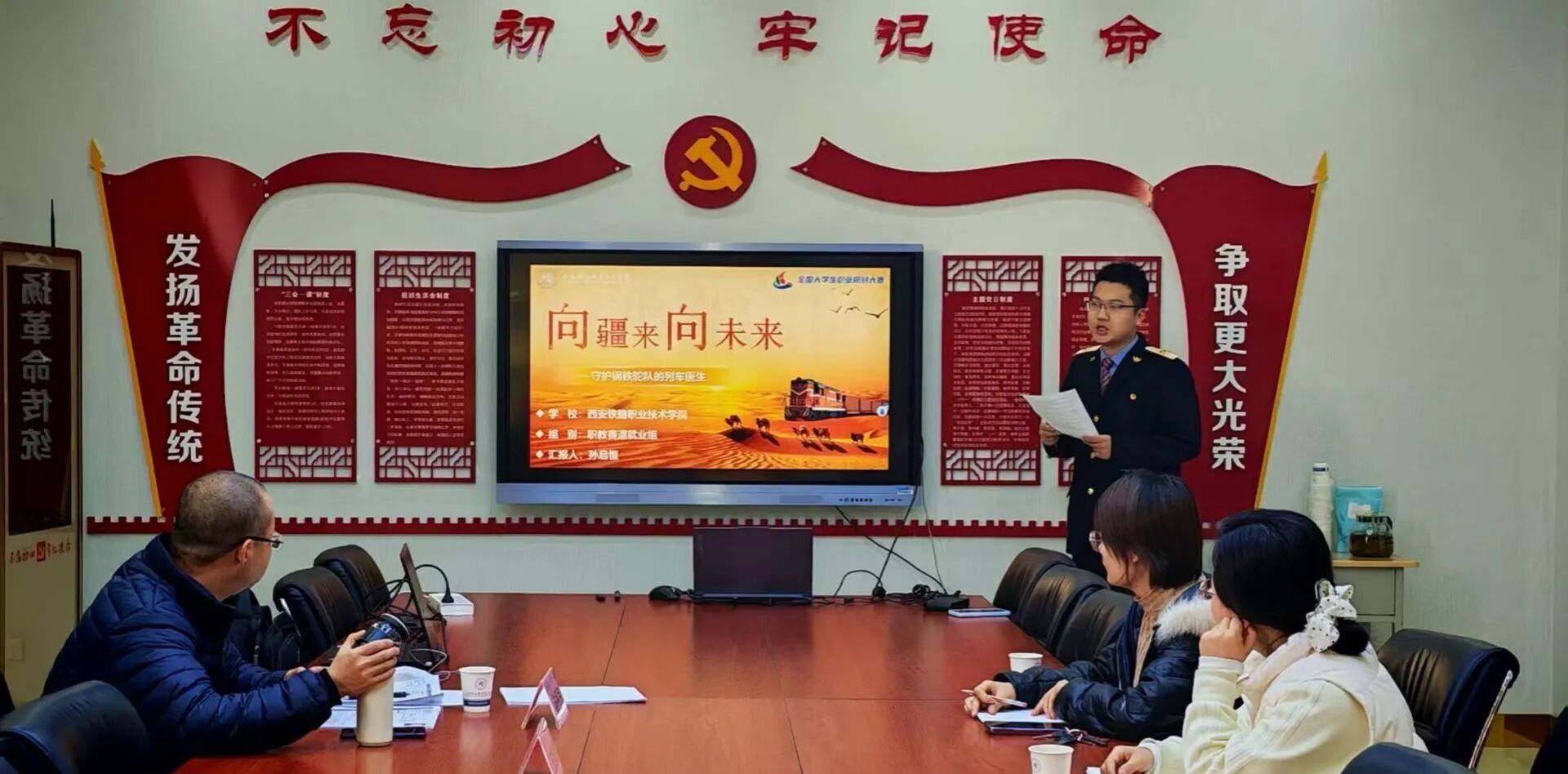 陈林泽、刘子涵两名学生在指导教师张曹辉、刘莉精心指导下,积极备赛,以“极致打磨”为准则,梳理核心专业课笔记,摘录专业知识点;利用周末和假期深入铁路现场,与在岗列车检车员深度访谈。在老师们带领下,不断完善规划方案,最终从容阐述从短期掌握基础检车流程,到中期成长为检车班工班长,再到长期跻身全路检车技术能手的职业愿景,赢得评委一致认可。