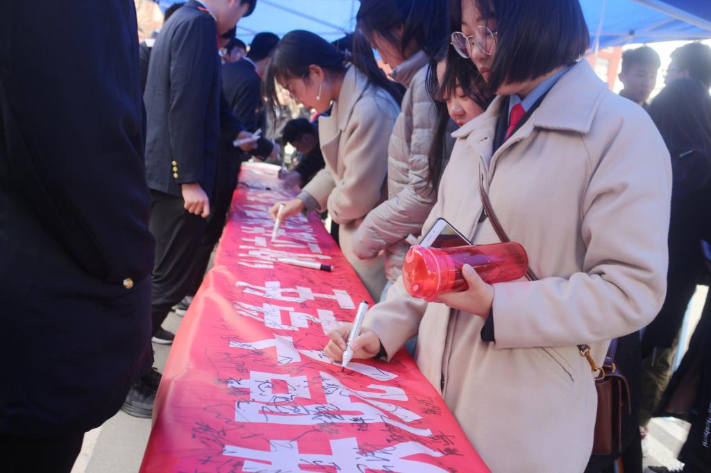 本次活动以宪法为核心的法律法规宣传教育为主线。同学们在餐饮中心门口向过往师生们发放了普法宣传单,普法宣传单从宪法在我国法律体系中的地位、基本内容、国家宪法日的由来、设立国家宪法日的重大意义以及宪法宣誓制度等方面进行了全面的解读,向学院师生普及宪法知识,弘扬宪法精神。同时,港务校区众多师生在“树立法治理念 弘扬宪法精神”的宣传横幅上庄重签下自己的姓名,共同倡导践行“学法、懂法、尊法、守法”,形成弘扬宪法精神、建设社会主义法治中国的良好氛围。