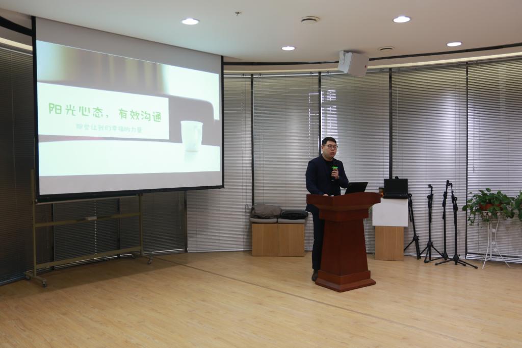 中国科学院应用心理学-临床与心理健康方向博士、国家心理咨询培训师、国家二级心理咨询师、高校心理学讲师刘刚老师受邀主讲。讲座分为“阳光心态”和“有效沟通”两大板块。刘刚用一张婴儿的表情图片引领大家开启了自我情绪状态的探索,用牛、鸡、草图片的自由组合解读了日常沟通的差异性和沟通类型的多样性,在轻松愉悦的氛围中开始了他的讲座。
