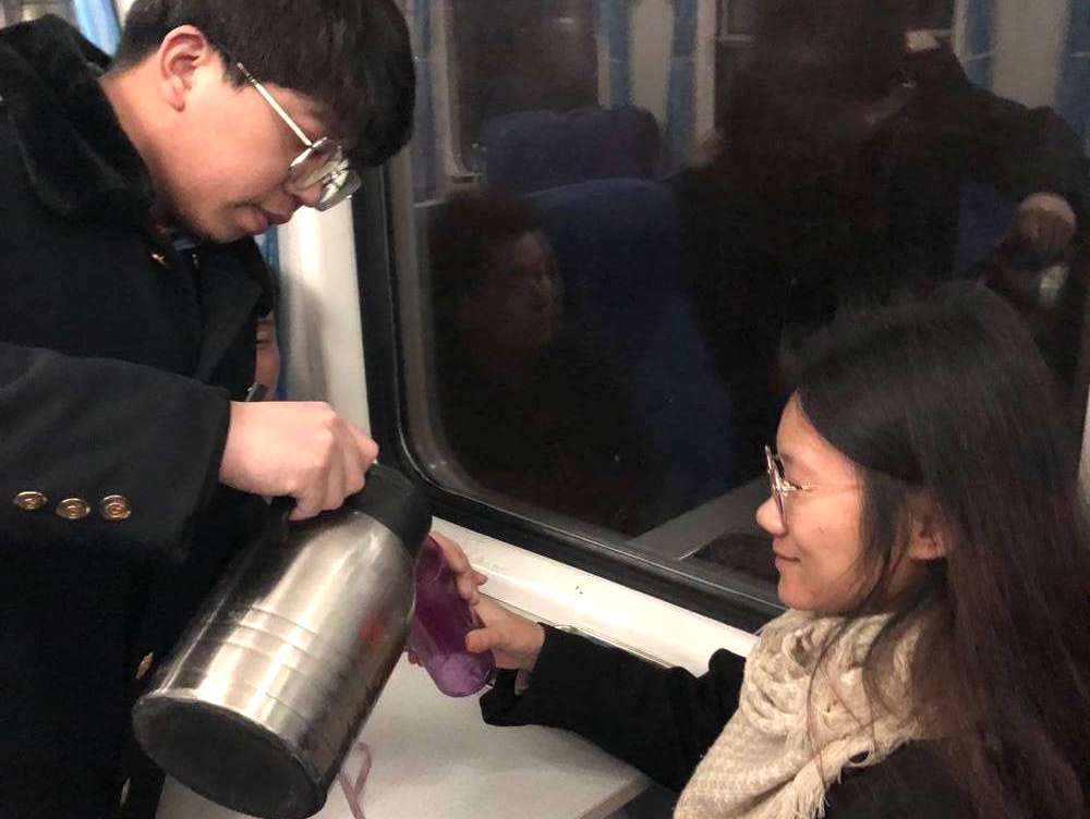 作为春运的参与者和见证者,列车员是本届大部分跟班实习学生的工作岗位,同学们工作收获颇多,锻炼颇大,感触也是颇深。乌鲁木齐车队沪临一组的马旭同学这样谈他的春运感受。他所值乘的西安到上海的列车,从寒风凛冽的北方到田园水乡的江南,一路欢笑,一路汗水,一路认真,一路坚持,蜿蜒在祖国大地上的不仅仅是宛如红色长龙的列车,更是他们年轻人精彩的身影、远飞的理想、激扬的青春和美好的回忆。在每次值乘中,安全都是重中之重,要确保客车运行安全,作为列车员的他严格执行各项作业标准,维持好旅客秩序,努力提供优质服务,为旅客安全保驾护航。每当旅客们平安到站,回报的每一个感激的眼神、每一句温馨的问候和每一抹淡淡的微笑,都是对他最大的鼓励,让他感受到这份工作的重量,感受到作为一名铁路人的骄傲。