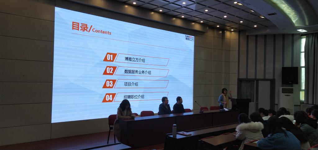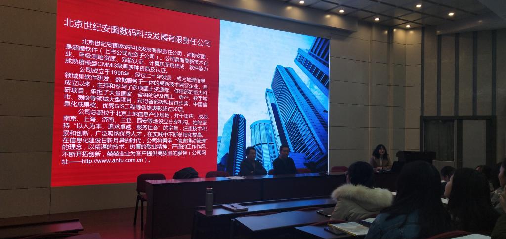 各公司首先在招聘会上进行公司介绍。西安民兴信息工程有限责任公司企业代表分别从研究与开发、产品与销售、质量保证、公司主要荣誉等方面简单介绍了公司的大体方向与发展趋势。“有多少人工就有多少智能”北京博雅立方科技有限公司成立于2008年,用北京大学的博雅塔和希望辛勤付出的所有员工以立方为单位的形式收获幸福,故取名为博雅立方。北京世纪安图数码科技发展有限责任公司西安分公司成立于1998年,经过二十年发展,成为地理信息领域集软件研发、数据服务于一体的高新技术民营企业。