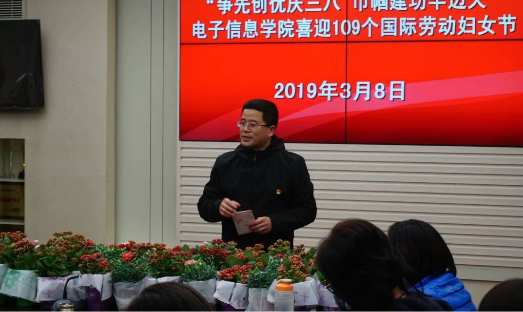 电子信息学院党总支张伟敏书记向全体女教职工们致以亲切的问候和节日的祝贺,并指出:我院77名教职工中女教职工有52名,占67.5%,在学院的教育教学各项工作中起着“半边天”的作用,为学院的发展做出了重要贡献。他表示:女教职工在做好本职工作的同时,还更多的承担着照顾家庭的责任,呵护着家庭的幸福和美满。在平凡的生活中以饱满的热情和执着的追求,为学院发展增辉添彩,默默奉献。