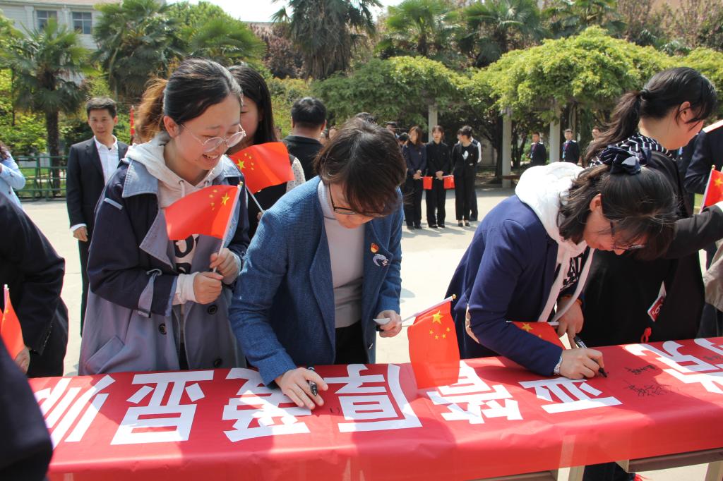 随后,全体党员教师在留言板写下了自己的庄严承诺,并在写有“忠诚教育心向党,严管厚爱显师德,拼搏冲刺展风采”的横幅上进行了集体签名。