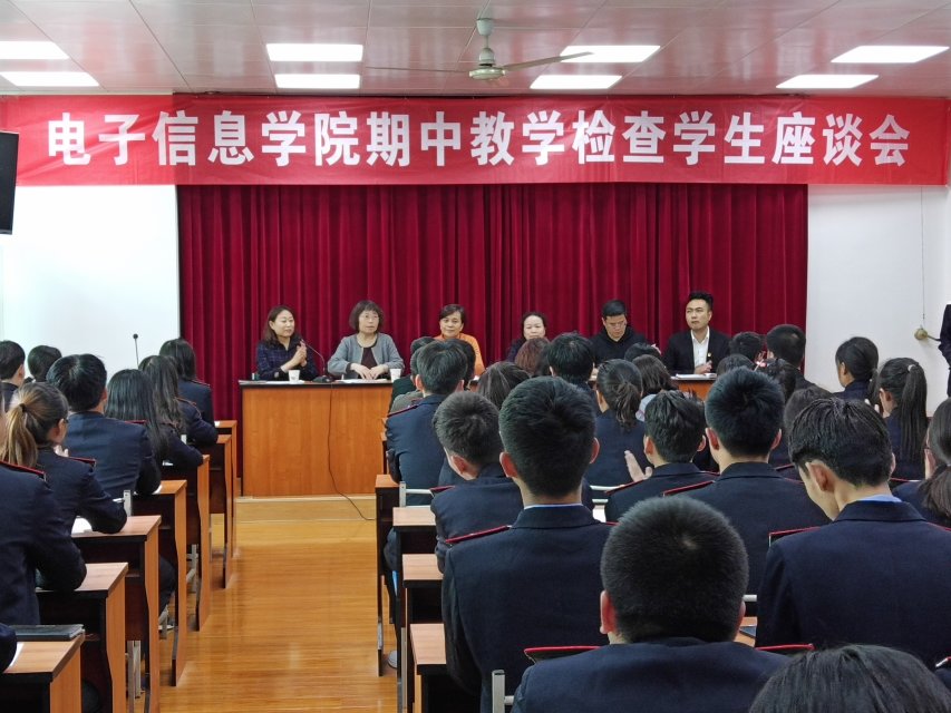 为深入全面了解本学期的教学情况,倾听广大学生的心声,更好地组织教学,电子信息学院10个专业24个班级的学生代表于5月8日下午在我院自强校区教学楼407召开期中教学检查学生座谈会。电子信息学院院长孙津平、党总支书记张伟敏、教务处副处长督导室主任史艺红、督导室吴麦仙教授以及学工办、教研室主任和72名来自各班的学生代表参加了座谈会,会议由电子信息学院办公室主任马荣主持。