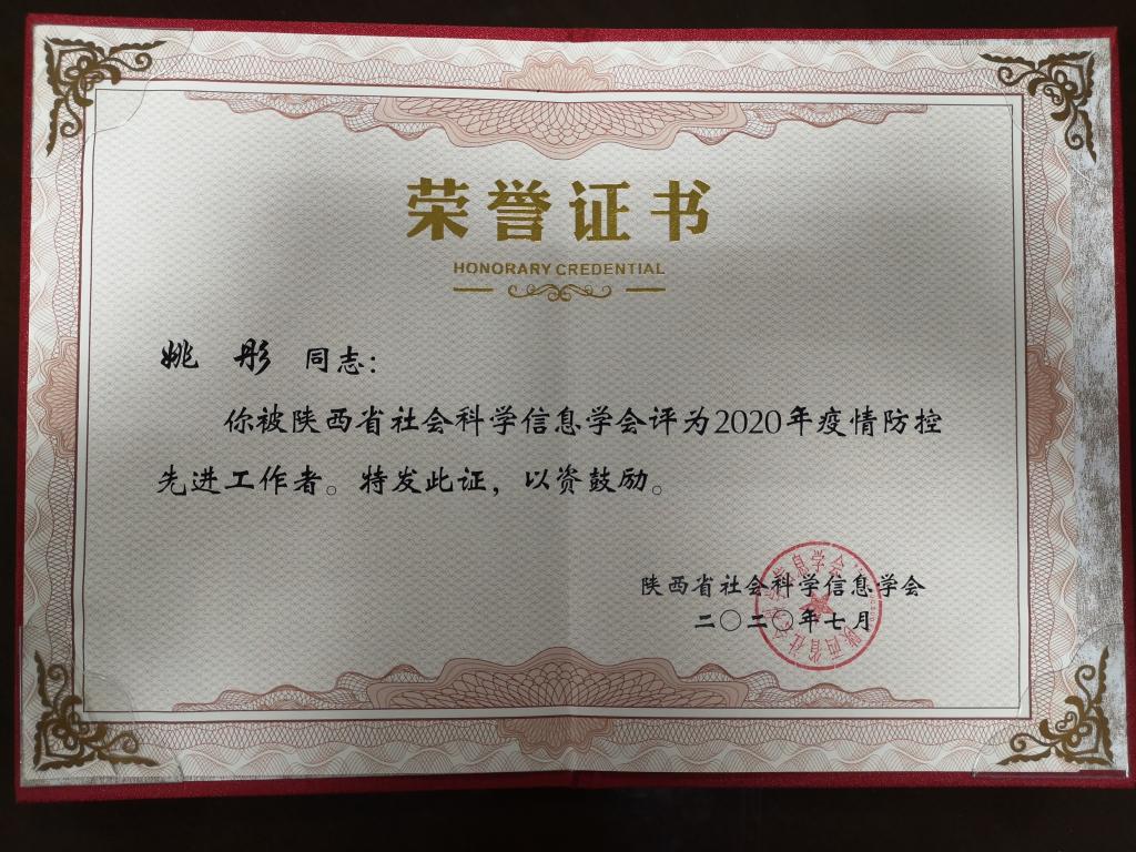 近日,陕西省社会科学信息学会召开了2020年陕西省图书情报档案学术年会。会上,对各成员馆在疫情防控工作中涌现出的先进集体和先进个人进行了表彰。我院图书馆姚彤同志被评为先进个人,也是全省高职院校唯一一位获此荣誉者。