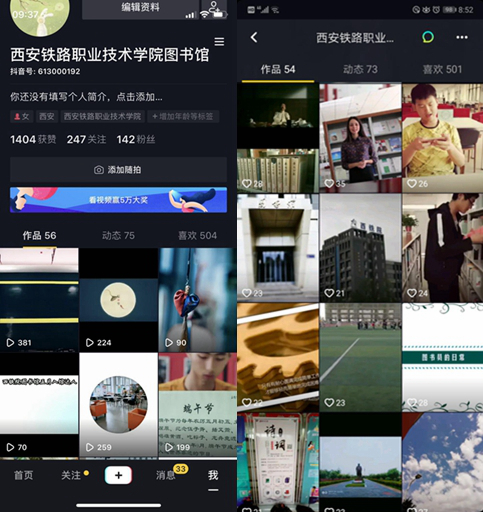 为发挥图书馆文化阵地的宣传作用,助力读书月活动的深入开展,图书馆精心组织策划了”读经典,学新知,表达自我,记录美好生活”的抖音作品征集活动。4月底注册了西安铁路职业技术学院图书馆抖音官方账号,并陆续发布了我院读者的原创视频作品。