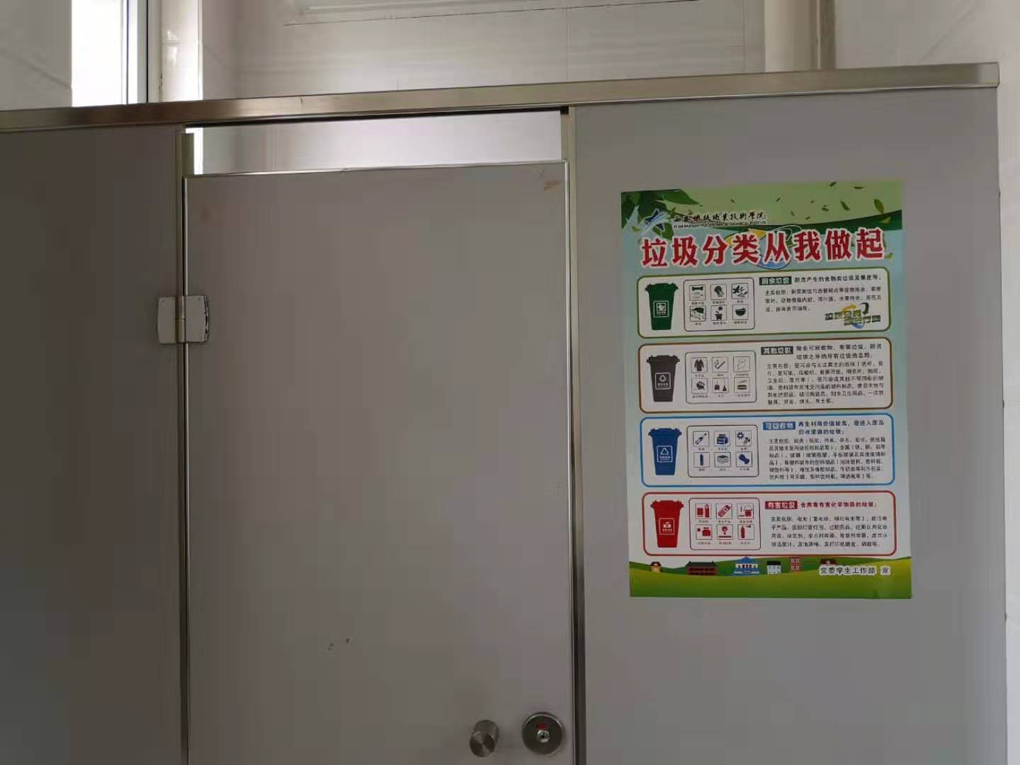 新学期伊始,在第一次班会课上对全体学生开展了垃圾分类知识教育,通过详细讲解可回收垃圾、有害垃圾、厨余垃圾、其他垃圾的分类与投放,结合学生在校期间生活垃圾的分类活动,使大家更好地了解和体验了正在实施的垃圾分类政策,环保教育收效良好。其次,在学生公寓片区等重点区域,通过悬挂条幅、布置展板等方式进行宣传,突出实效,扩大宣传覆盖面,积极倡导学生坚持良好生活习惯,实施垃圾分类,共享绿色生活。此外,开展了宣传教育进公寓、进宿舍活动,深入到学生生活的每一个角落,通过在公寓内醒目位置、各学生宿舍张贴 “垃圾分类 从我做起”宣传海报,时刻提醒学生重视日常生活垃圾分类工作,真正从小事做起、从我做起,为建设绿色文明校园贡献一份力量。