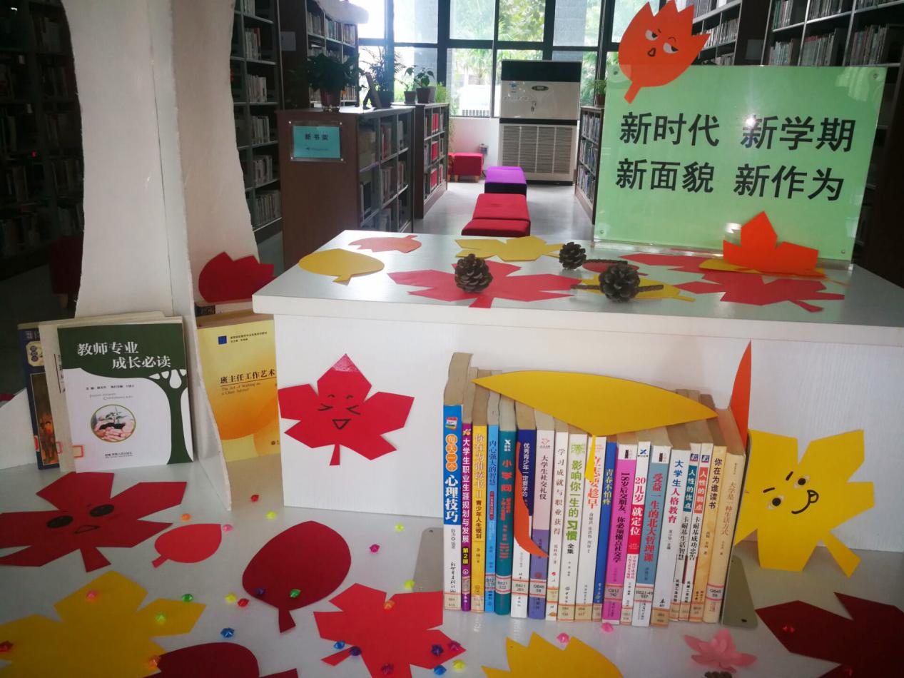 图书馆在教师节前夕组织同学们精心制作了寓意为“桃李满天下”的手工作品,感恩老师辛勤付出,祝福老师节日快乐!并精选了《教师专业成长必读》、《班主任工作艺术》等书籍进行展示,为老师教学、管理提供帮助。为新生推荐了《立志要趁早》《你在为谁读书》等书籍,帮助新生树立远大的人生理想,教会他们如何提高学习效率、提升阅读能力,尽快地适应大学学习生活。