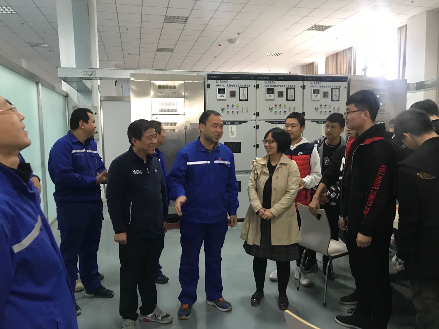 王蒲民一行先后参观了正在建设的室内接触网演练场和城轨牵引变电所实训室和铁道供电实训中心,参观到智能供配电实训室时,供用电技术教研室闫泊老师正在进行实验教学,王蒲民一行观摩了教学过程。课间休息时,王蒲民和学生进行了交流,作为老校友,他鼓励学生们认真学习,为国家的轨道交通事业奉献力量!