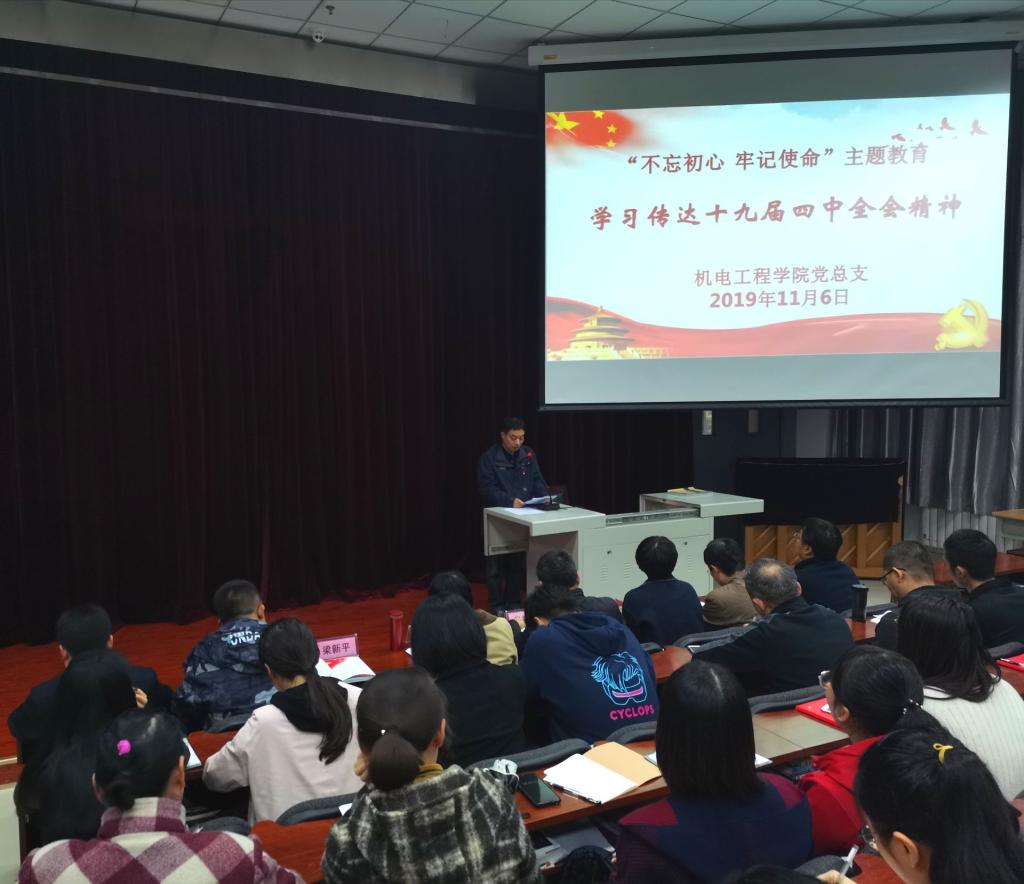 为进一步推进“不忘初心 牢记使命”主题教育,根据学院党委主题教育工作要求,11月6日下午,机电工程学院党总支召开十九届四中全会精神学习会。全体教职工和学生代表约200人参加了此次集中学习。学习会由党总支组织委员学工办副主任谷茂庆同志主持。