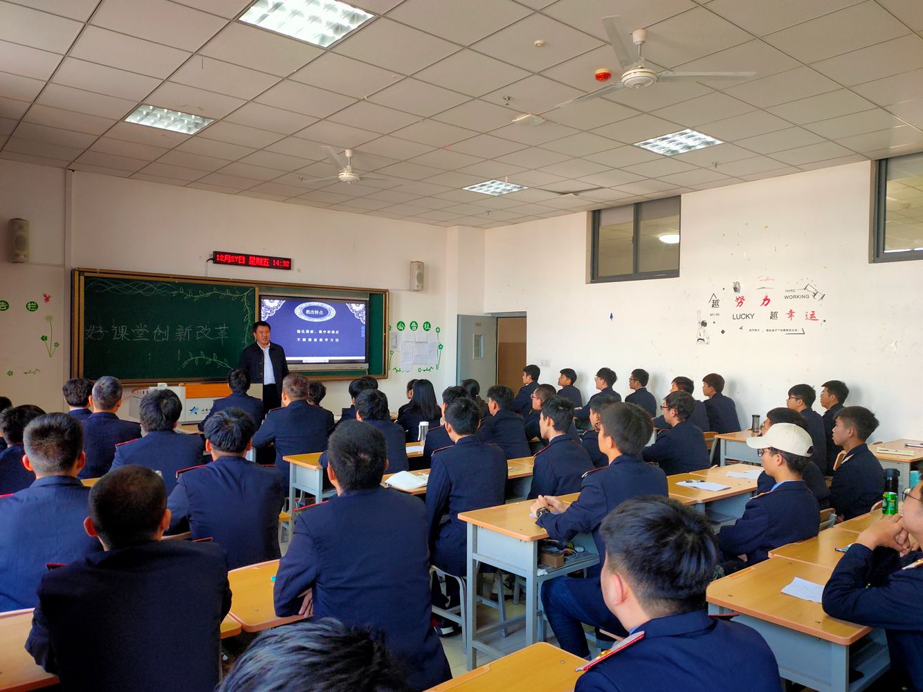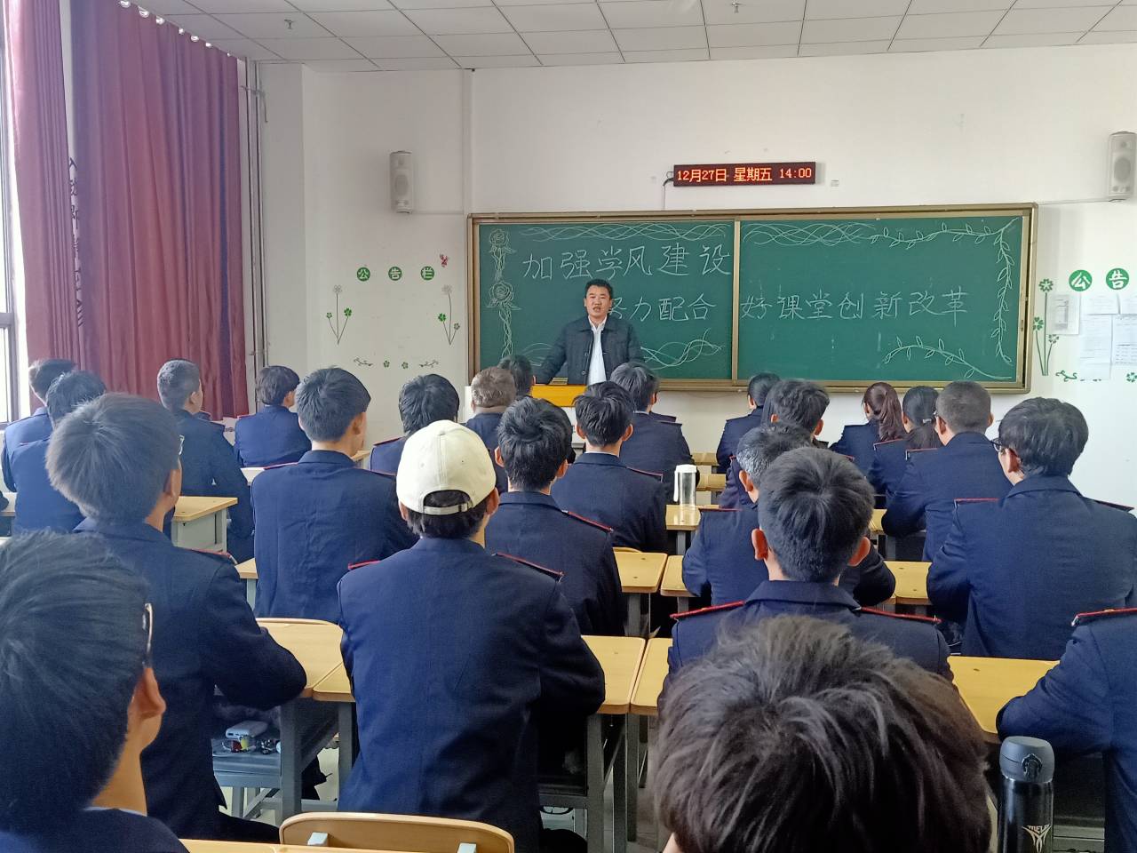 12月27日下午,机电工程学院院长代礼前在教学楼306教室为动车组检修1904班全体同学上了一堂生动的思政课,主题是“加强学风建设,努力配合好课堂创新改革”,全体同学认真聆听。
