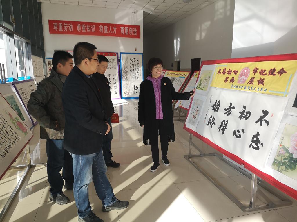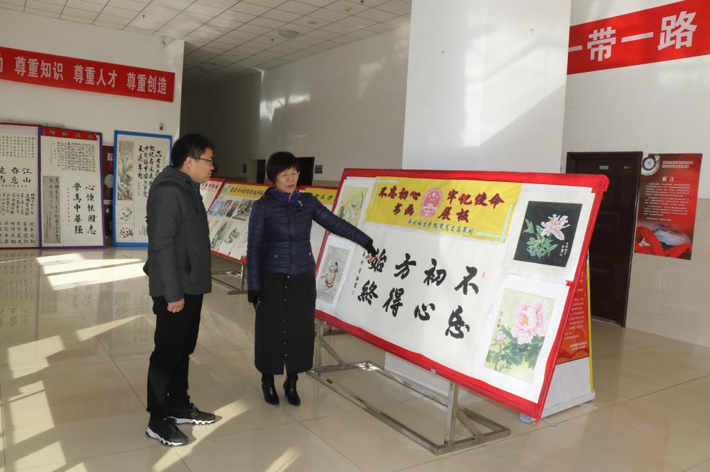 12月27日,机关后勤党总支党群支部书记张爱民,带领支部党员蒋博文、王臻一行参观师生书画展,并给予了高度肯定。