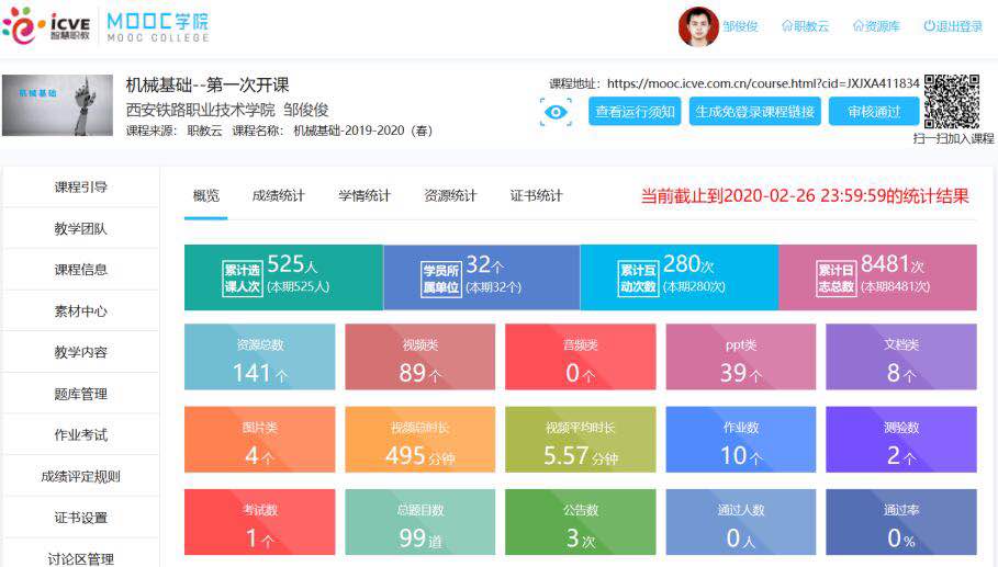 该课程主要面向铁道施工和养路机械制造与维护专业开设,目前共1个班45名学生参与线上学习。由党员教师李菁承担全部线上教学工作。