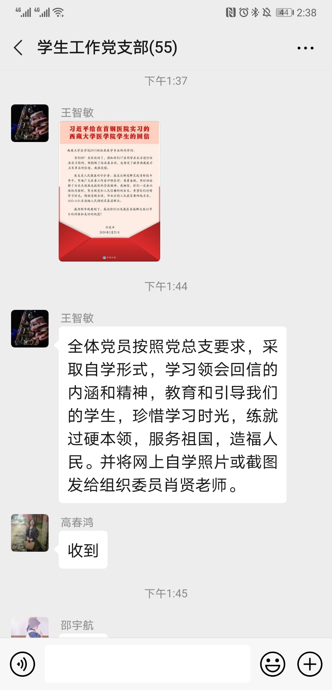 教学第一、第二、第三党支部及综合党支部通过线上党员大会(扩大)组织支部所属全体教师通过QQ群、微信群、“学习强国”APP、腾讯视频会议等方式开展线上学习交流讨论活动。学生工作党支部通过支部微信群开展线上党员大会,对习近平总书记的回信原文进行学习,并组织开展了研讨交流;同时还组织安排全体学生以班级为单位通过线上主题班会等方式开展学习讨论活动。