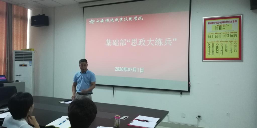 按照学院要求,为了贯彻落实中办国办《关于深化新时代学校思想政治理论课改革创新的若干意见》(中办发〔2019〕47号),积极响应《进一步深化陕西学校思政课教师“大练兵”主题活动的通知》精神,基础部于7月1日上午进行“思政大练兵”活动,学院副书记邓耀斌、教务处处长滕勇、思政教科部主任景延鹏莅临现场全程指导。