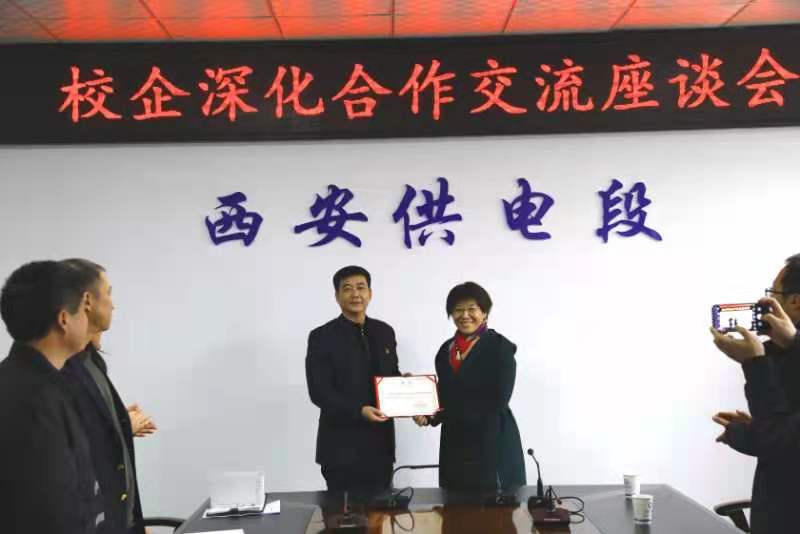 在座谈交流中,王保华对电气工程学院一行表示热烈欢迎,并介绍了西安供电段的总体情况,表达了开展校企合作的美好愿景,其他领导和部分我校优秀毕业生也就各自关注的问题与老师们进行了分享。和晋秦为王保华颁发了供用电技术专业企业带头人聘书,并介绍了电气工程学院教育教学和学生综合素质培养情况,张秀红介绍了电气工程学院教学相关工作情况。双方就人才需求方向、课程设置、共建教学资源、新技术攻关、职工培训、学生思政教育和人文素质教育等方面进行了深入有效的交流,达成了合作共识。