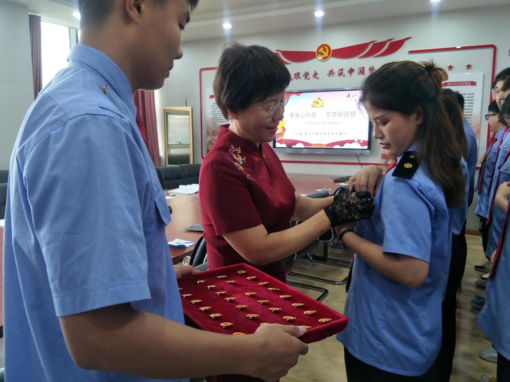 学生工作党支部的党员们为学生党员佩戴党徽后,马纪带领全体新党员面向党旗庄严宣誓:“拥护党的纲领,遵守党的章程,履行党员义务,执行党的决定,严守党的纪律,保守党的秘密”,这是全体新党员对党的真挚誓言,也是新党员对自己新身份的一次深刻认识。