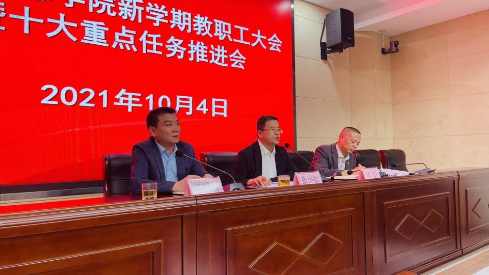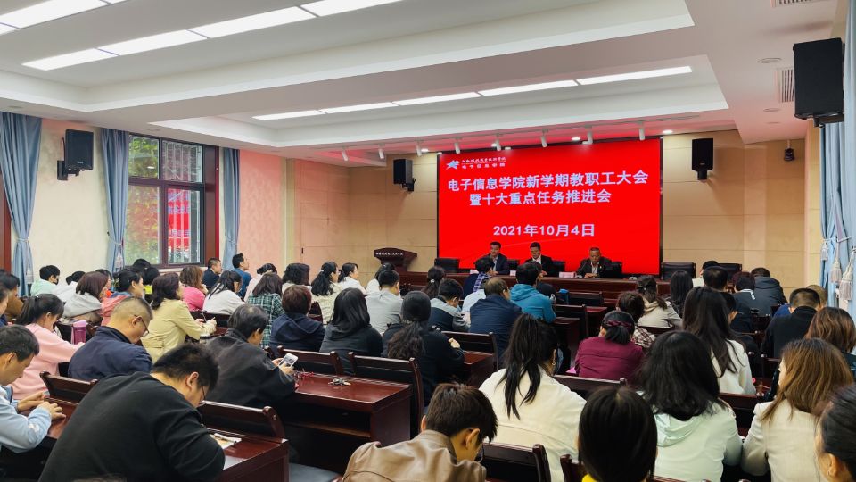 下午2时10分,电子信息学院在自强校区干培教室召开2021-2022学年第一学期全体教职工大会暨十大重点任务推进会,总结梳理上学期和暑假期间工作,部署安排新学期主要工作。电子信息学院全体教职工参加会议。
