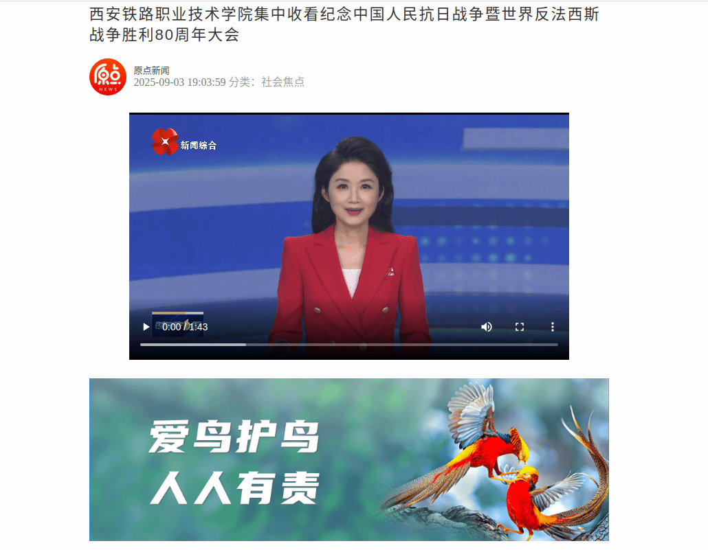 西安铁路职业技术学院集中收看纪念中国人民抗日战争暨世界反法西斯战争胜利80周年大会