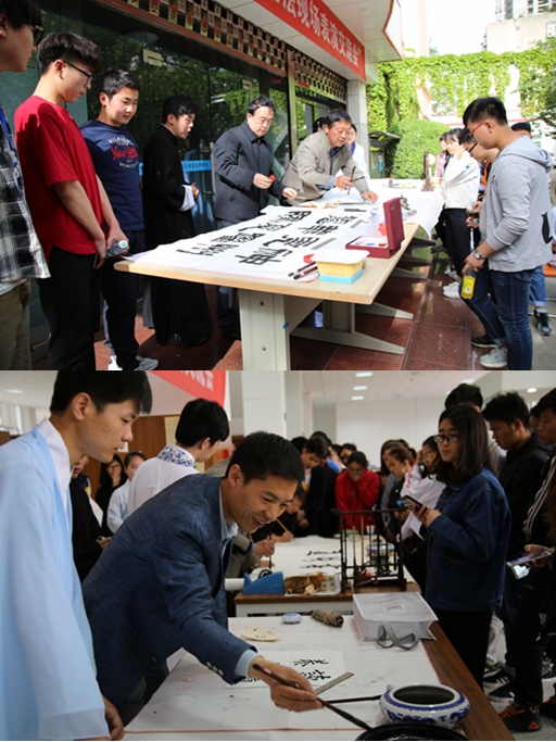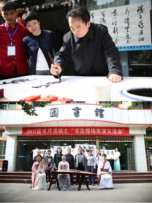 4月18日、19日下午,图书馆分别在自强校区和港务校区举办了“书法现场表演交流会”读书月主题活动。