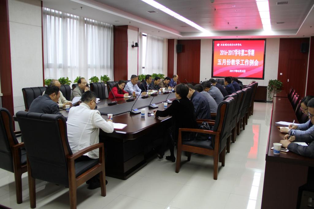 教务处处长滕勇汇报四月份重点工作的完成情况:下发《2017年教师技能大赛活动通知》、《关于修订2017级人才培养方案的通知(讨论稿)》和《2017年在线通识课学习通知》等文件;完成2017年度陕西高等教育教学改革研究项目申报材料的上报工作;完成陕西高校教育教学工作专家推荐工作;组织参与2017年全国职业院校技能大赛及专指委、行指委组织的铁道行业技能大赛;举办并召开2017年“新道杯”创新创业训练营暨第三届大学生“互联网+”创新创业大赛推进会;完成学院教学实验室安全工作自查报告并上报教育厅。