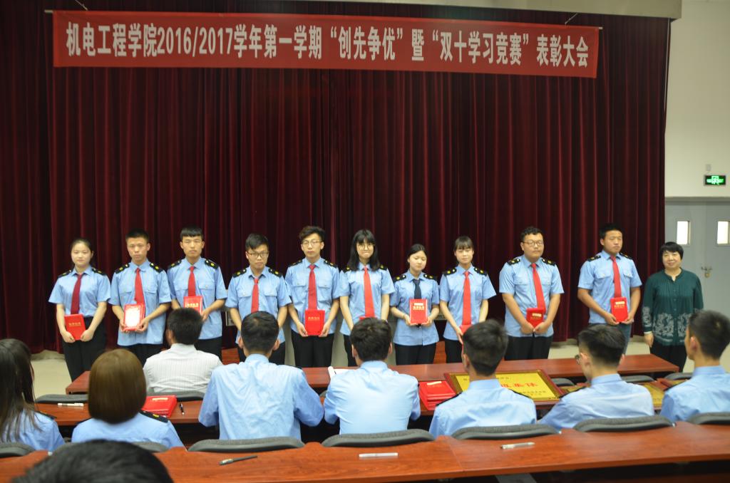大会宣布了机电工程学院2016-2017学年第一学期“创先争优”暨“双十学习竞赛”活动中受表彰的铁道车辆1502班、铁道车辆1603班、动车检修1602班三个先进班集体及326名先进个人名单,张雅兰、代礼前向获奖的先进集体和先进个人代表颁发了荣誉证书。会上,来自铁道车辆1603班的张文卓同学作为学生代表进行发言,动员同学们要珍惜大学时光,尽早做好职业规划、把握每一次锻炼和学习的机会,不断培养和提高自身的综合能力。