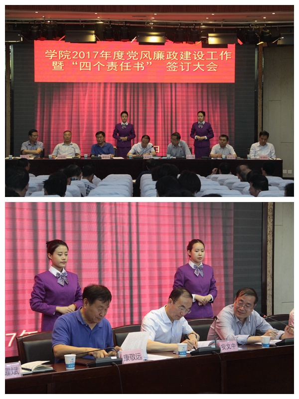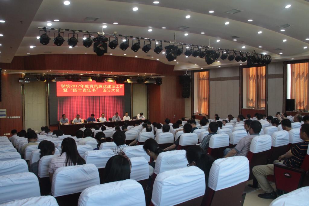 5月17日下午,学院召开2017年度党风廉政建设工作暨“四个责任书”签订大会,学院领导班子全体成员出席会议。院长田和平主持会议,党委书记安文中作总结讲话。