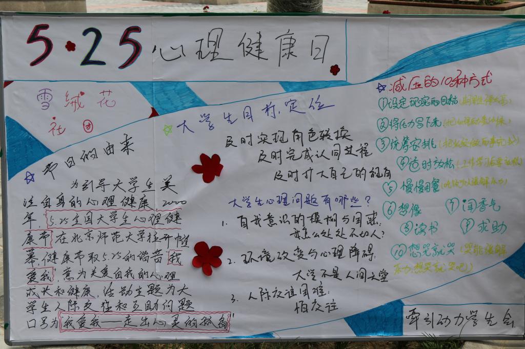 “雪绒花”心理社团开展心理健康知识宣传活动。“5.25”前夕,“雪绒花”心理社团通过展板,将有关心理健康的知识及其大学生目标定位、心理减压的方法介绍给全体同学,使同学们对心理健康知识有了更深刻的了解,也更加关注自己及周围同学的心理健康。