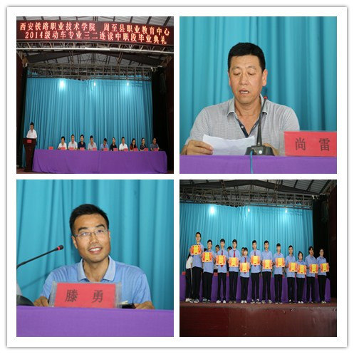 27日,学院党委学生工作部部长郭小莉、教务处处长滕勇、机电工程学院院长代礼前等参加周至职教中心的结业典礼。周至县教育局副局长尚雷祝贺全体学生顺利毕业,感谢全体教师三年来的无私奉献和倾心培养,并希望各位学子坚持学习终身、善待他人,在校训的指引下,取得更大的成功。滕勇代表学院向顺利完成中职段学业的全体学生表示祝贺,向三年间悉心培养、传道授业的学校领导和全体教师们表示感谢,他特别强调学院关于学业预警的规定,勉励各位同学牢记领导和老师的教诲,端正态度,为下一步的学习和就业打好坚实的基础,最后就转段报到后的具体事项进行了通报。机电工程学院学工办主任王晓民办理学生交接手续。