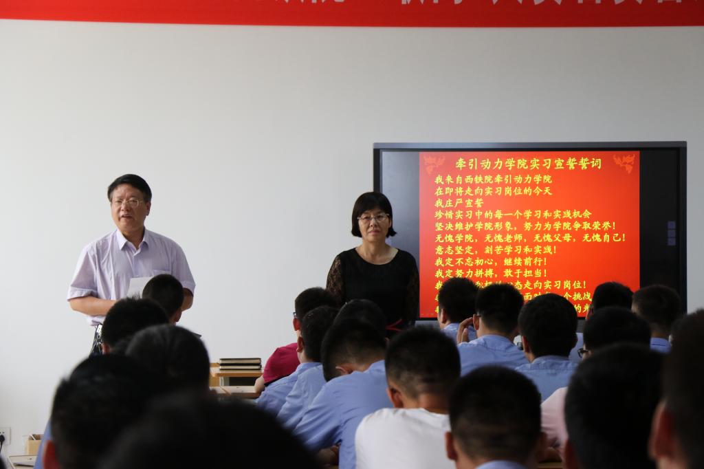 为深化校企合作,强化责任担当,提高毕业实习质量,根据学院“2+1”人才培养模式要求,6月29、30日,学院牵引动力学院在阶梯教室和216联合教室分别召开牵引动力学院赴西安铁路局实习学生动员大会,并举行实习学生宣誓仪式。牵引动力学院院长李益民、牵引动力学院党总支书记和晋秦,分别作实习教育动员讲话,502名实习学生参加大会。