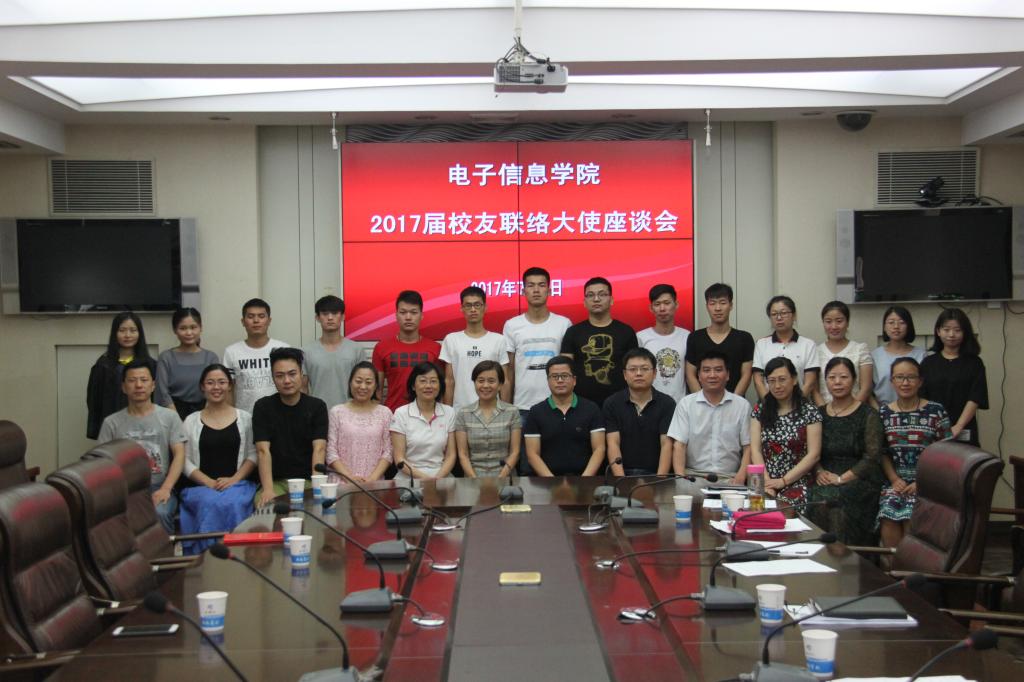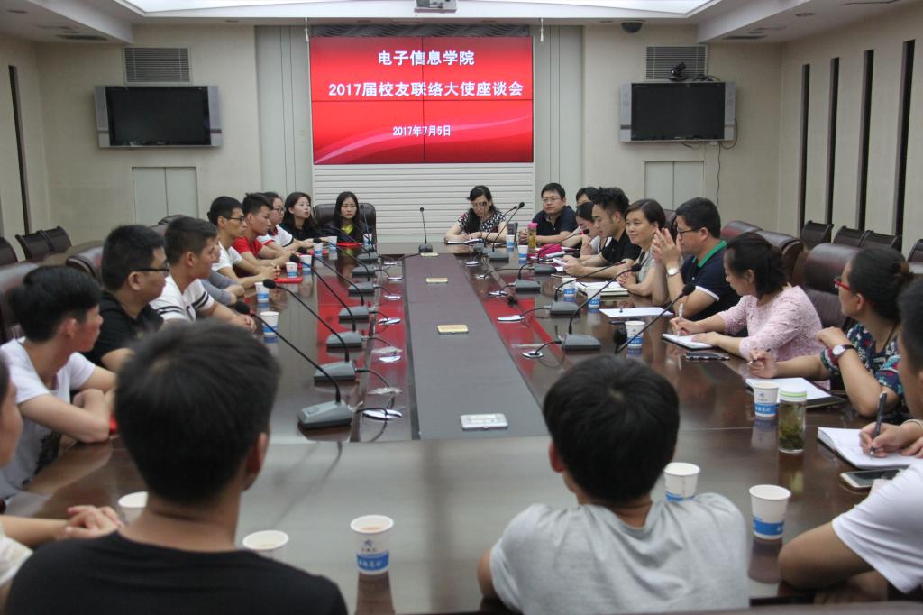 随后,在第三会议室召开2017届电子信息学院“校友联络大使”座谈会。出席会议的有电子信息学院院长孙津平、电子信息学院党总支书记张伟敏,电子信息学院院办主任马荣、校友联络大使团秘书长翁娜。本次大会由电子信息学院学工办副主任薛明主持。