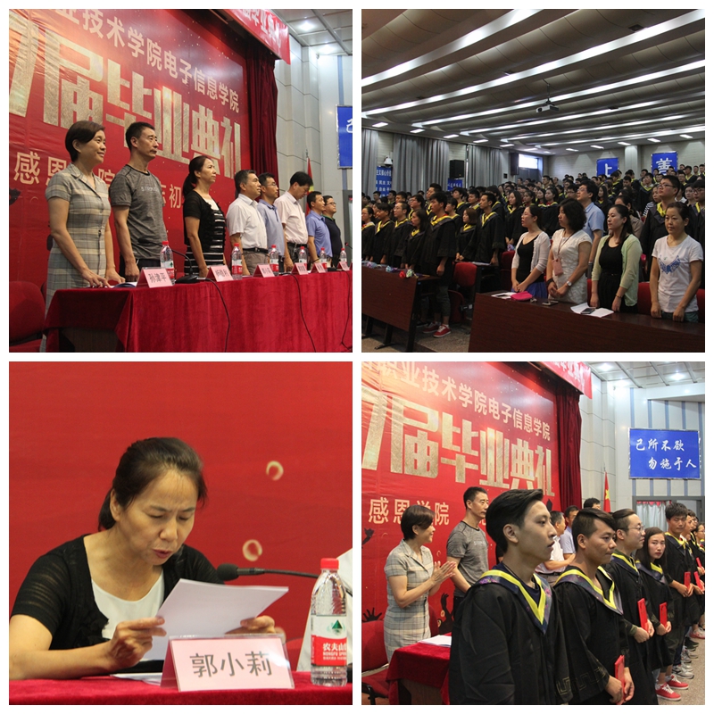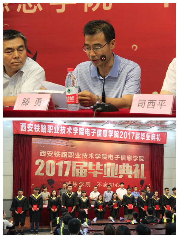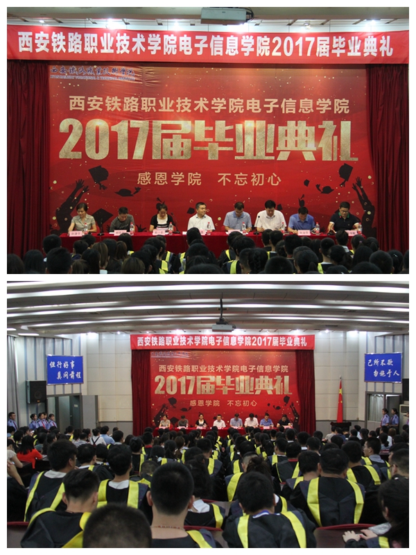 7月5日上午,学院电子信息学院2017届毕业典礼在该院阶梯教室隆重举行。本次毕业典礼以“感恩学院、不忘初心”为主题。参加会议的有学院党委副书记纪委书记黄家昌,党委学生工作部部长郭小莉、学院团委书记张治平、教务处处长滕勇、继续教育学院院长司西平、自强校区管理办公室主任杨稳利、电子信息学院院长孙津平,该院全体班主任、辅导员以及教研室全体代课教师。毕业典礼由电子信息学院党总支书记张伟敏主持。