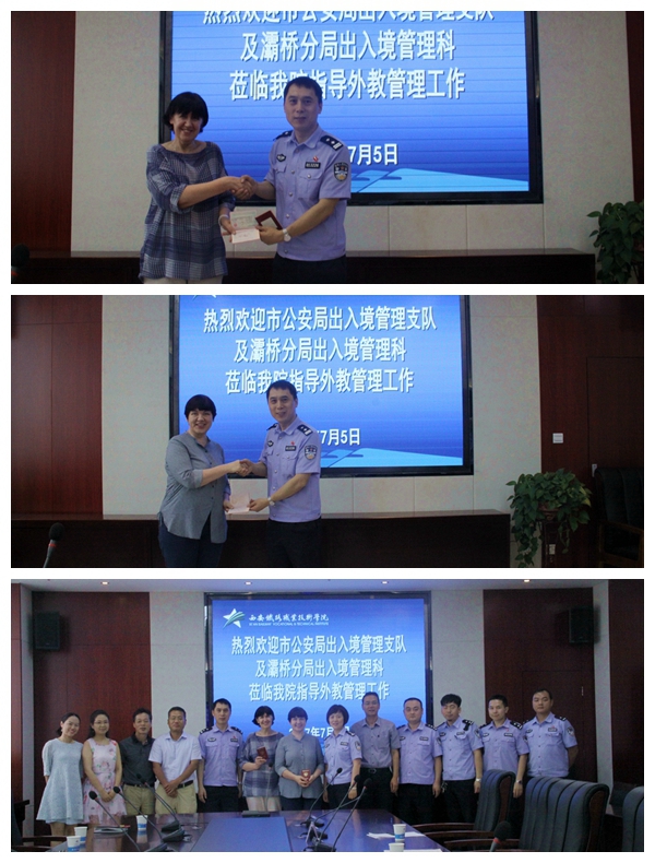 7月5日,市公安局出入境管理支队副支队长宋阳、外管二科科长严高峰、灞桥分局出入境管理科科长王俊瑜等五位干警专程来到我院为两名外籍专家送上了他们的居留证。同时,就最新外事管理政策和服务理念进行了宣讲。