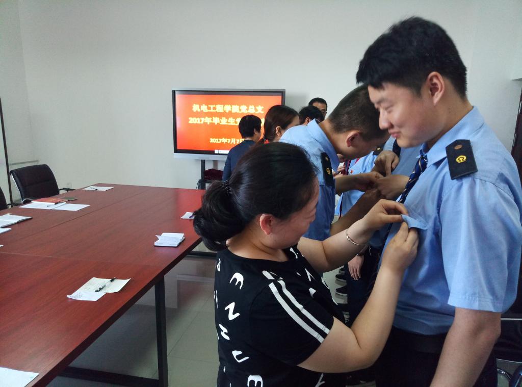 机电工程学院党总支书记张雅兰同志向毕业生党员提出了三点希望:一是希望全体毕业生党员要坚持加强思想政治学习,带着问题学、明确目标学,反复研读党章、党规以及习近平系列重要讲话,力求铭记于心,领会其精髓,以实际行动落实好中央“两学一做”学习教育常态化、制度化的要求;二是要时刻牢记自己是一名共产党员,时时处处发挥先锋模范作用。与党中央时刻保持高度一致;三是希望大家要遵守承诺,走好人生路,母校期待着你们传回捷报的那一天。