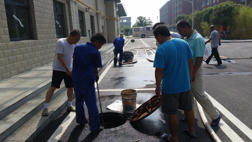 7月25日起,总务科用时一个多星期,对港务校区化粪池和食堂油池进行清理。为确保作业安全,避开中午的持续高温,清理工作安排在早上和晚间进行。工人们忍受着刺鼻的气味,通过冲、捞、抽的方式,把2尺多厚500立方的坚硬堆积物一点一点清理干净,将食堂后面200米长、60公分粗的油池管道进行了疏通和清洗。化粪池和食堂油池清运垃圾达60车。