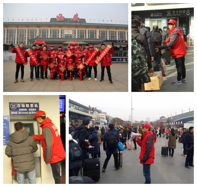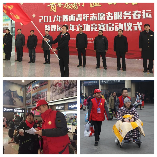 2017年1月13日陕西省青年志愿者服务春运暨春运青年立功竞赛启动仪式在西安北客站隆重举行。参会的有陕西省文明办副主任、省少先队总辅导员、西安铁路局相关领导以及省内部分高校的相关负人。参加仪式的还有来自省内各高校、地铁、公路等系统300多名志愿者及铁路青年代表。