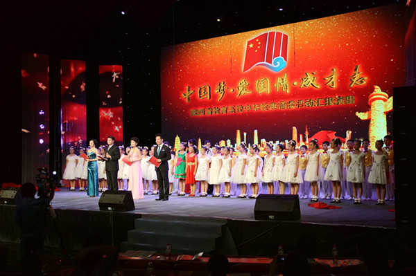 9月14日,陕西省教育系统“中国梦•爱国情•成才志”中华经典诵读活动汇报演出在西安曲江国际会议中心大礼堂隆重举行。来自全省各级各类学校的千余名师生代表齐聚一堂,用饱含深情的朗诵、大气豪迈的歌声,倾情诉说建设和谐美丽陕西,复兴伟大中华民族的历史使命。本次汇演节目共有15个,分为《三秦颂歌》、《信念无疆》和《中国梦想》三个篇章。节目内容丰富,异彩纷呈,一批师生原创作品讴歌了真善美,凝聚了正能量,令在场观众无不为之动容。