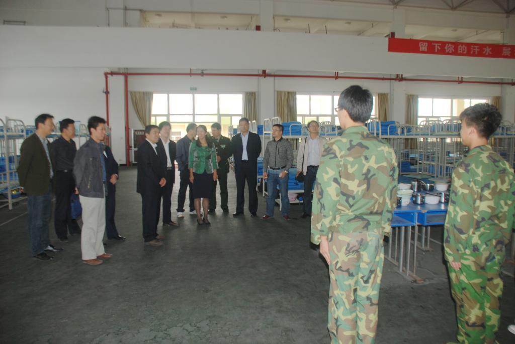 到基地后,黄书记详细听取了军训团政委吴领合从“领导重视定军心,后勤保障稳人心,严格施训练恒心,学员投入表决心,教师工作有耐心,积极防控增信心,后期展望显雄心”等七个方面关于军训情况的汇报后,对2013级的军训工作给予了充分肯定。接着听取了基地关于军训工作相关情况的汇报后,表示今后要进一步加强学校与军训基地的沟通,不断深化学生思想政治教育和解放军优良传统教育的有机结合,形成寓教于训、合力育人的军训模式。基地领导高度肯定了我院严谨求实、扎实细致的军训团工作以及参训学员们昂扬向上的精神风貌,表示将继续科学施训、严格管理,圆满完成后续军训任务。 随后黄书记一行视察了学生宿舍、食堂和医务室等地,并和部分学员进行了交谈,了解军训学生的生活、医疗等情况,并对军训基地和学院的带训教师表示慰问。