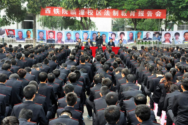 10月17日下午,临潼校区特邀陕西省未成年犯管教所纪委书记、三级警监翟学荣在校区北操场举行了以“法制在我心中”为主题的大型法制教育专场报告会。校区主任熊奇、党总支书记张国邦及1600余名师生现场聆听了报告,报告会由学工办主任朱栋夫主持。