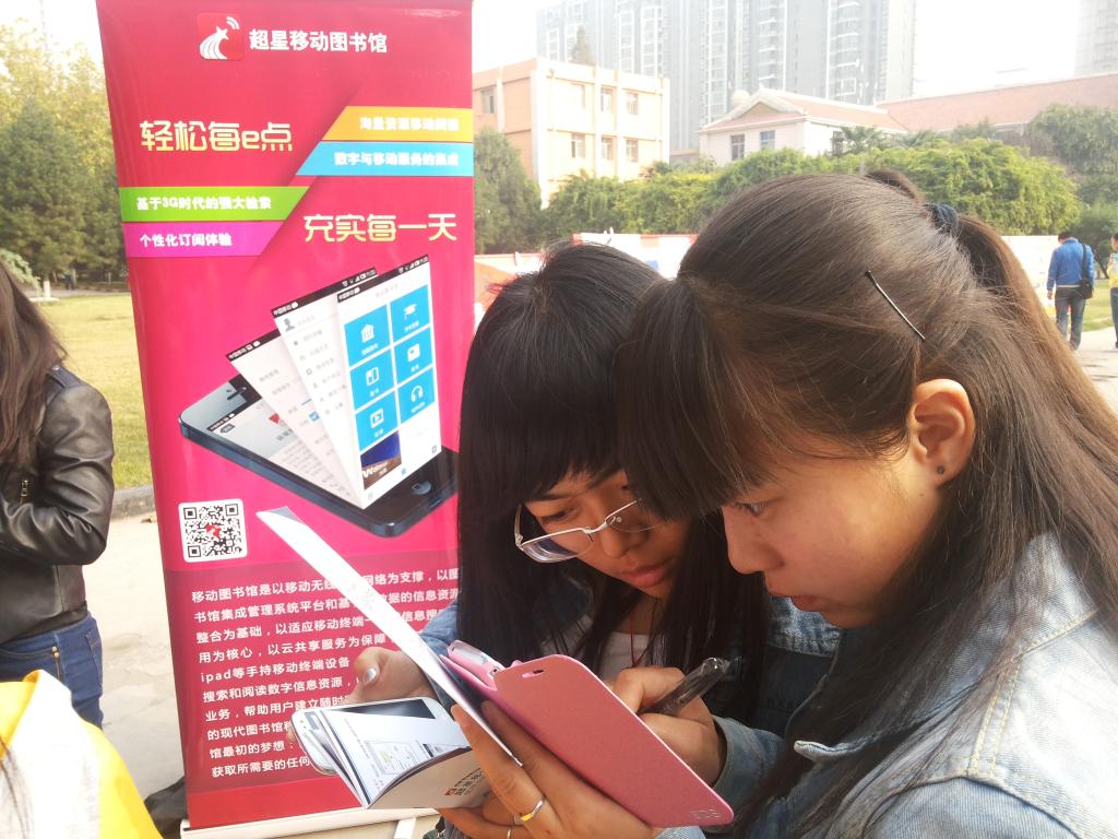 为了让更多的人了解“手机移动图书馆”,10月17日下午,图书馆邀请超星公司工作人员,在詹天佑广场举办了“超星手机移动图书馆”读者体验活动。